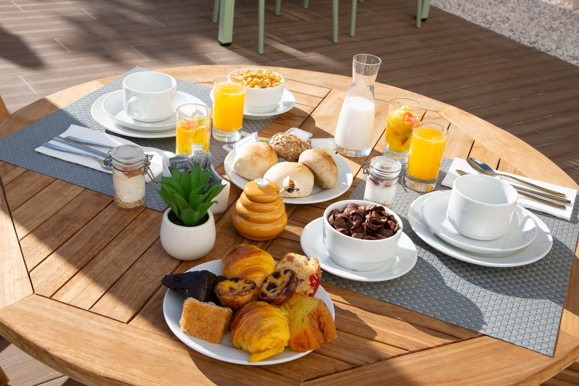 Desfrute de um café da manhã completo que inclui frutas frescas, cereais, frios, frios, laticínios, sucos, etc. Temos a possibilidade de piquenique, itens vegetarianos e sem glúten.